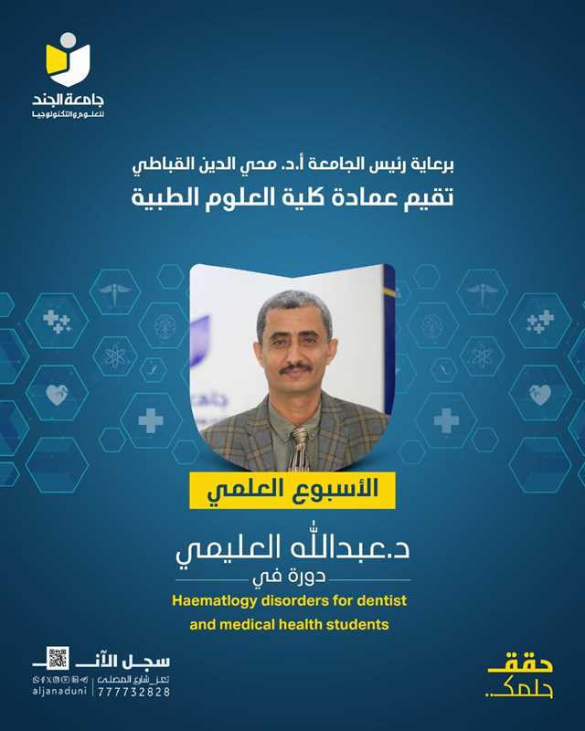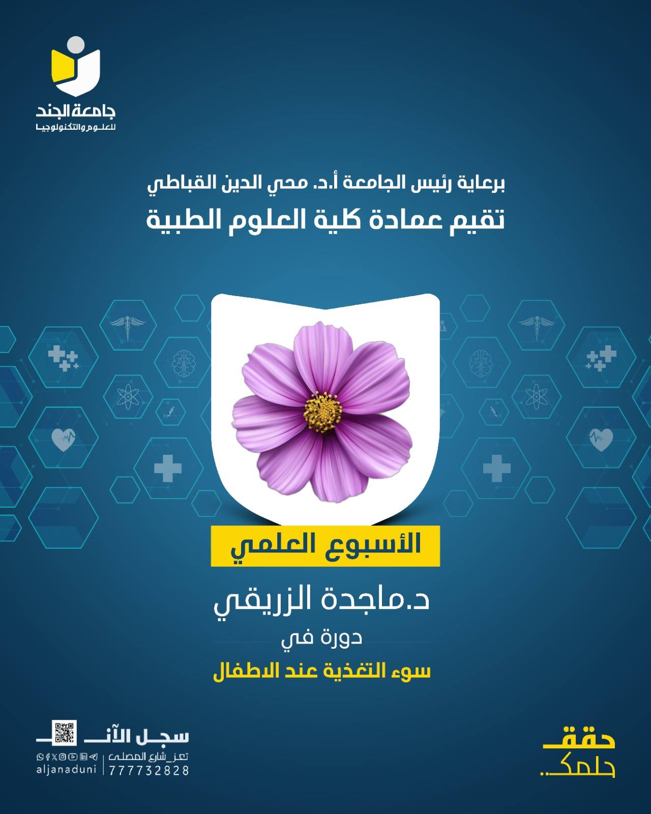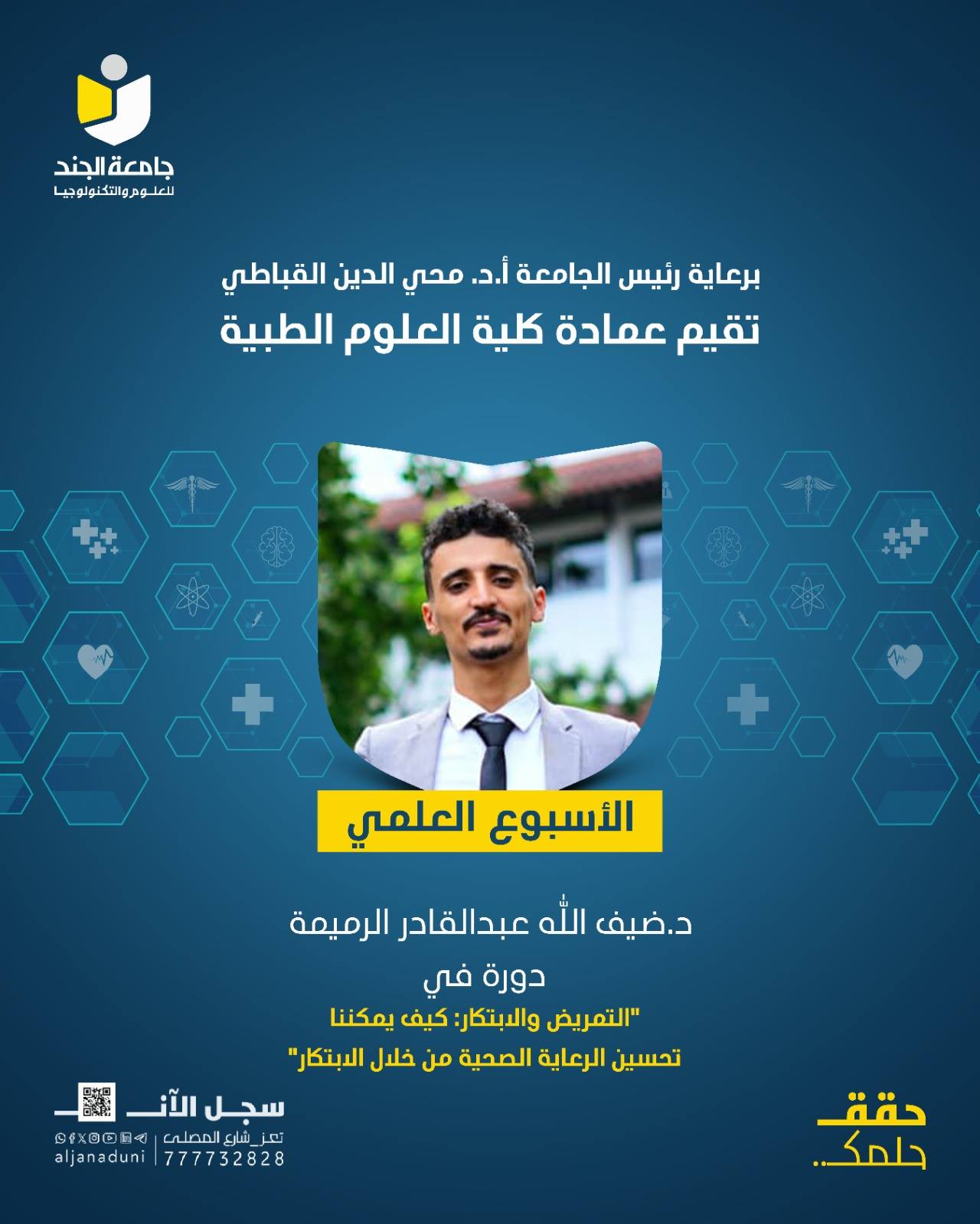 🎯 الفئة المستهدفة: للراغبين في الالتحاق بالأسبوع العلمي من طلبة العلوم الطبية في جميع الجامعات ، يمكنكم التسجيل في الجامعة بدءاً من يوم غد الثلاثاء حتى الخميس القادم.