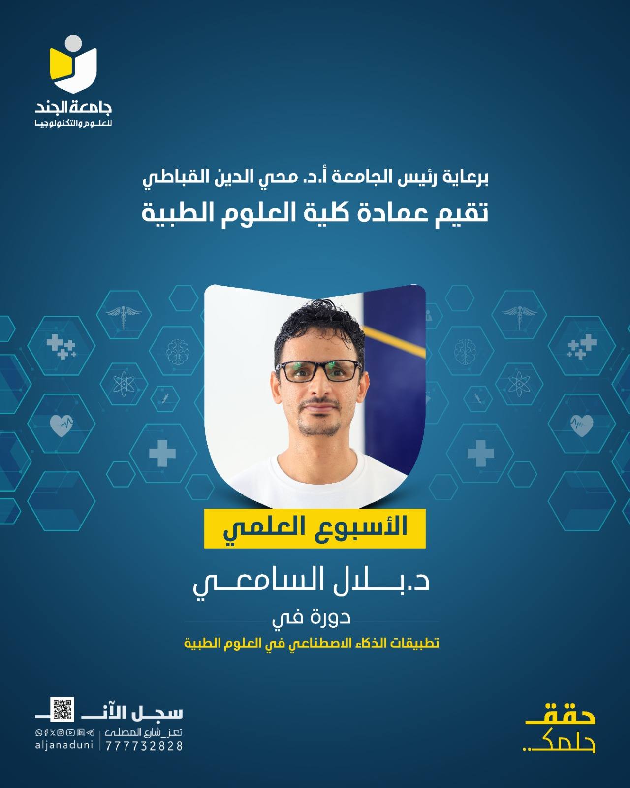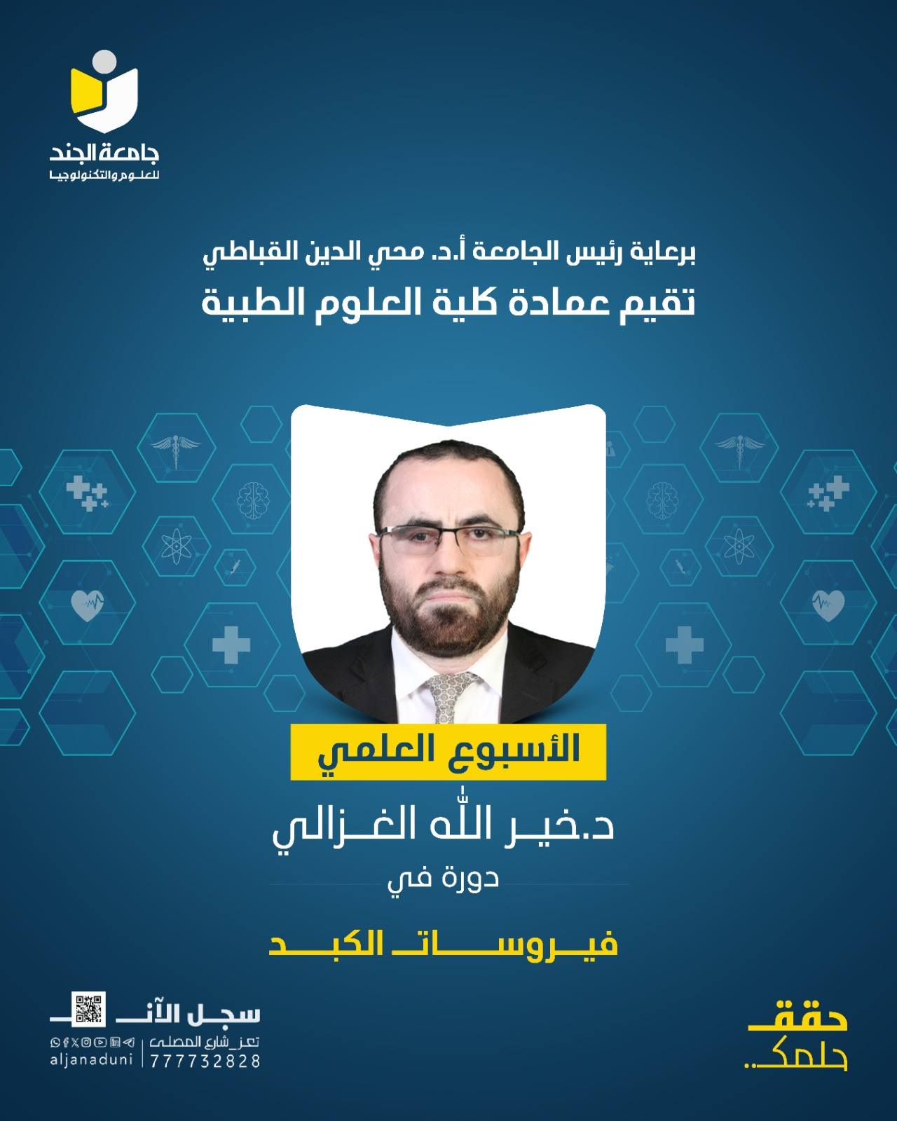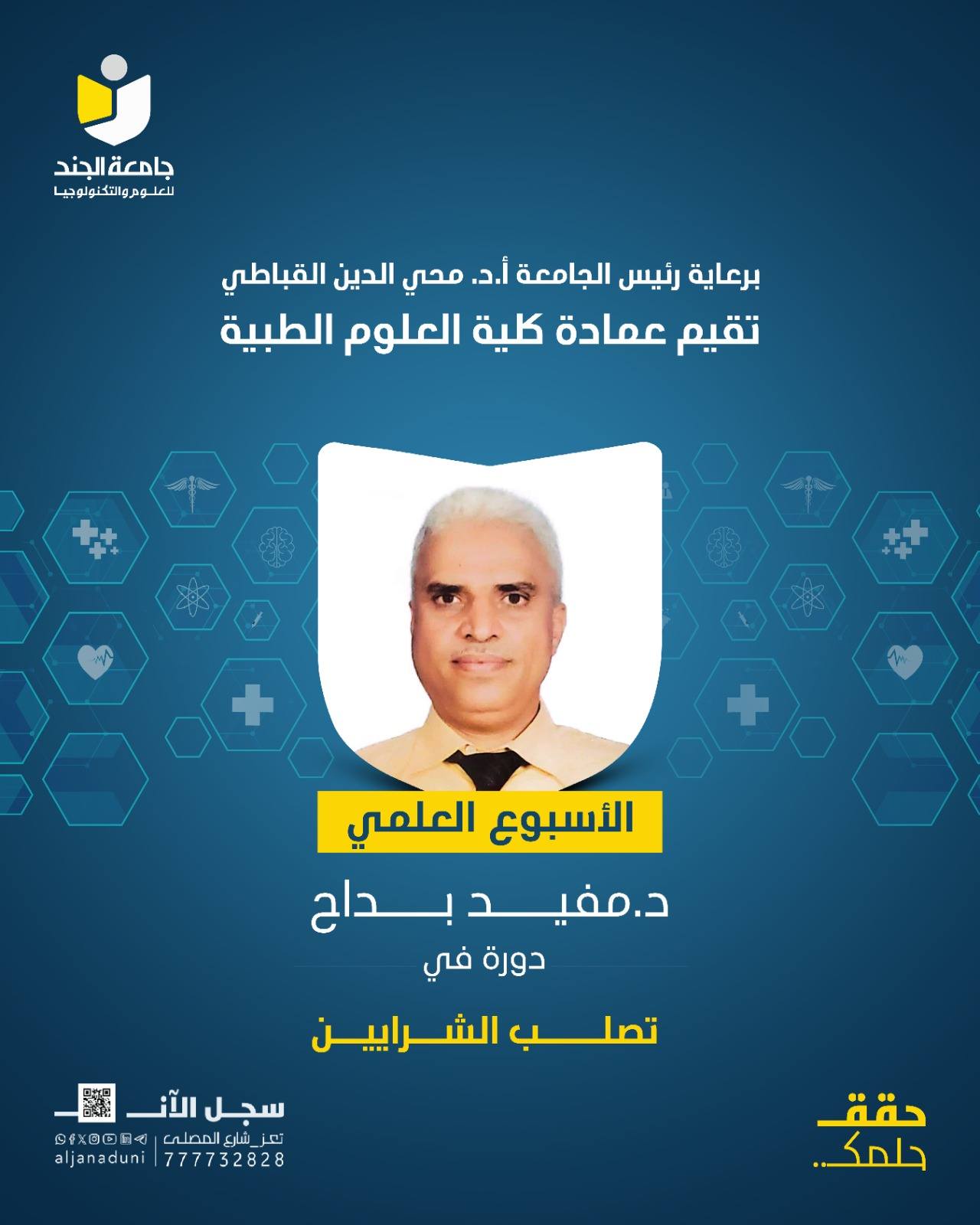 🎯 الفئة المستهدفة: للراغبين في الالتحاق بالأسبوع العلمي من طلبة العلوم الطبية في جميع الجامعات ، يمكنكم التسجيل في الجامعة بدءاً من يوم غد الثلاثاء حتى الخميس القادم.