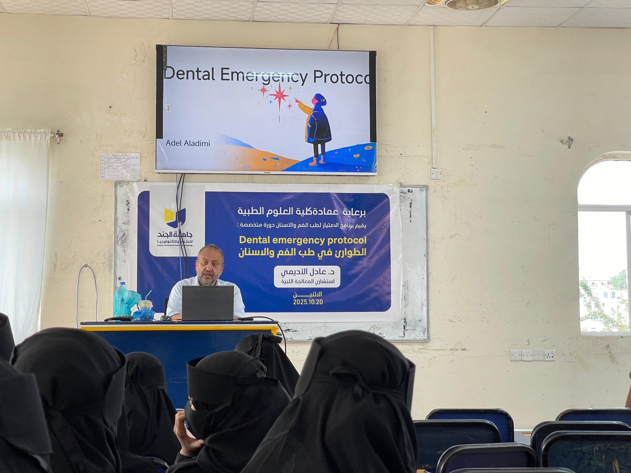 نظم برنامج الامتياز بقسم طب الفم والأسنان في الجامعة ،اليوم، دورة تدريبية متخصصة بعنوان "بروتوكول الطوارئ في طب الفم والأسنان – Dental Emergency Protocol"، برعاية عمادة كلية العلوم الطبية ، وذلك ضمن سلسلة الأنشطة الأكاديمية والتأهيلية التي تهدف إلى تعزيز المهارات السريرية ورفع كفاءة خريجي البرنامج.