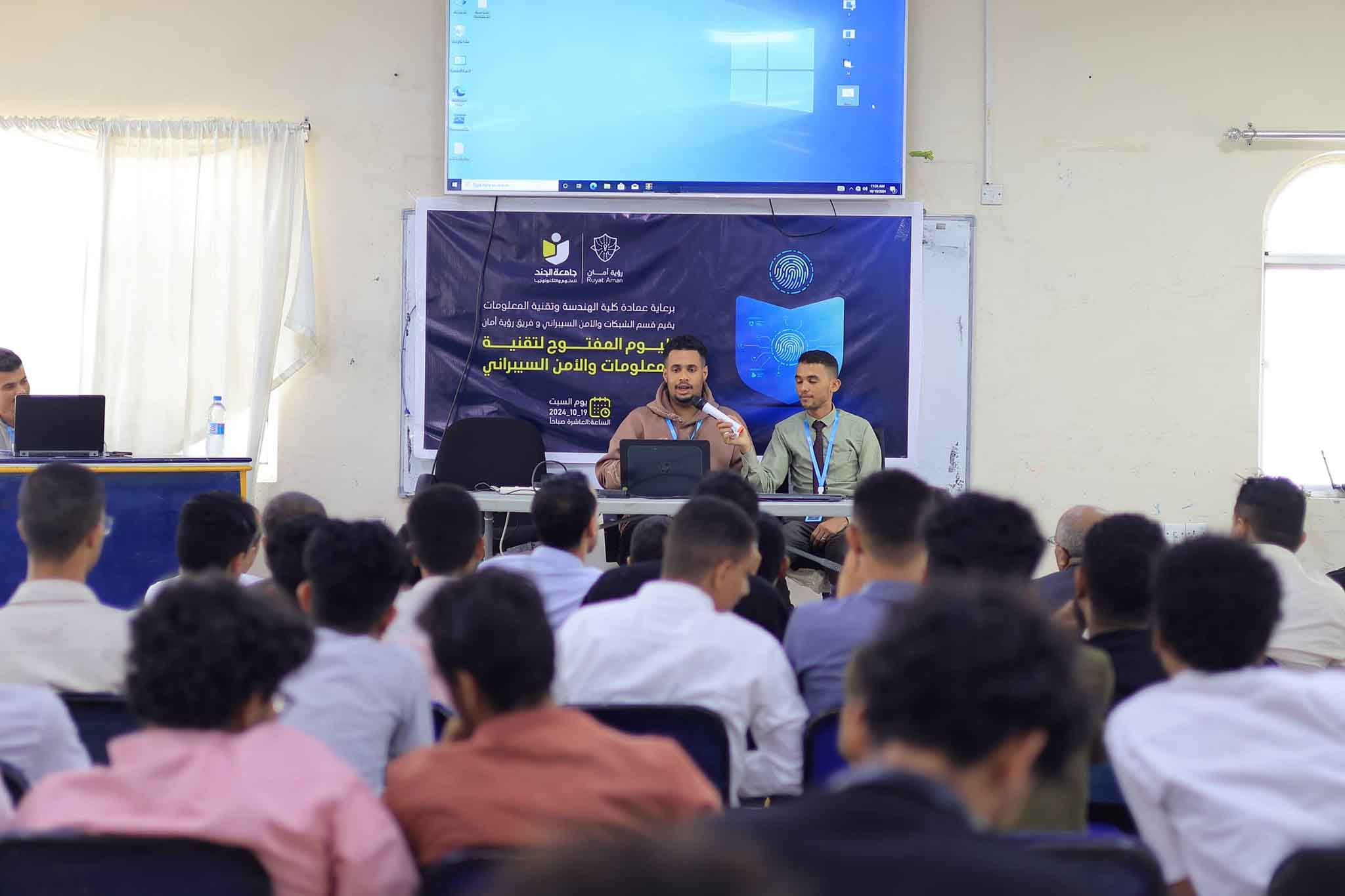 The Department of Networks and Cybersecurity, in coordination with the Aman Vision Team (a student team specializing in cybersecurity), organized an open day focused on Information Technology and Cybersecurity. The event, held under the auspices of the Dean of the Faculty of Engineering and Information Technology, was attended by university leadership and numerous managers from banks, financial institutions, and private companies.