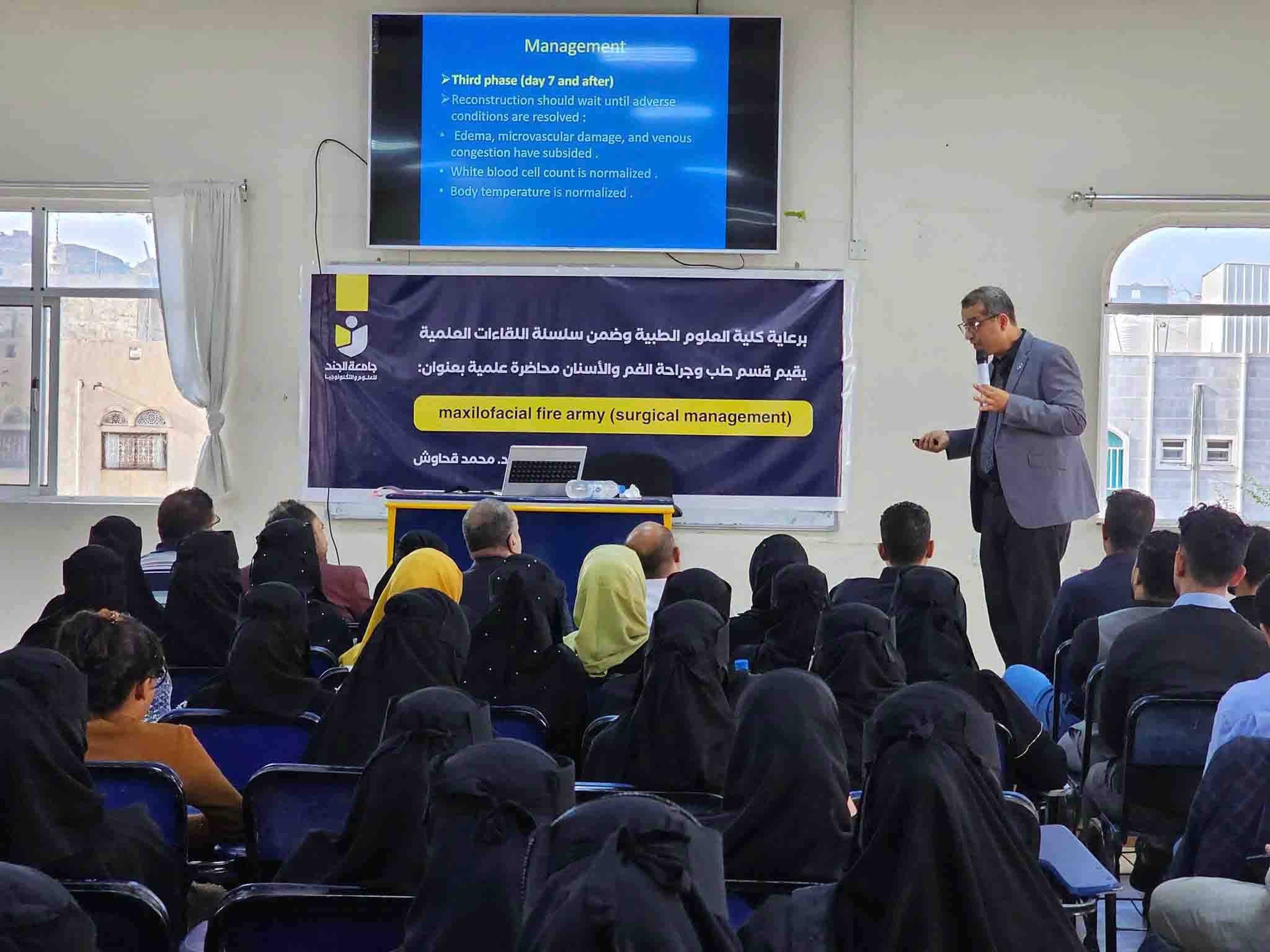 نظم قسم طب وجراحة الفم والأسنان بالجامعة ،الخميس، محاضرة علمية ضمن سلسلة اللقاءات العلمية التي تنظمها الكلية والقسم برعاية عمادة كلية العلوم الطبية حول جراحة الوجه والفكين بعنوان :Maxilofacial fire army (surgical management).