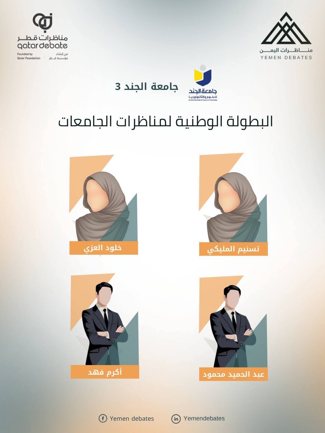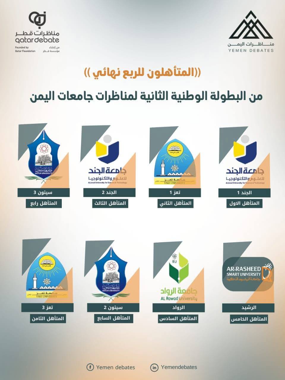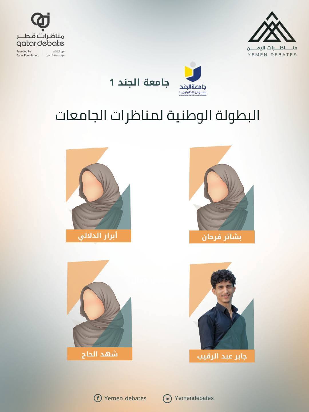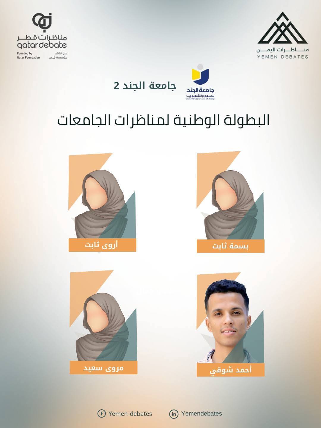 شاركت جامعة الجند للعلوم والتكنولوجيا في البطولة الوطنية الثانية لمناظرات جامعات اليمن بثلاثة فرق طلابية، ضمن منافسة ضمّت 28 فريقاً يمثلون 14 جامعة حكومية وخاصة من مختلف المحافظات اليمنية. وتعد هذه البطولة محطة تأهيلية للبطولة الدولية لمناظرات الجامعات المقرر إقامتها في العاصمة القطرية الدوحة منتصف العام الجاري.