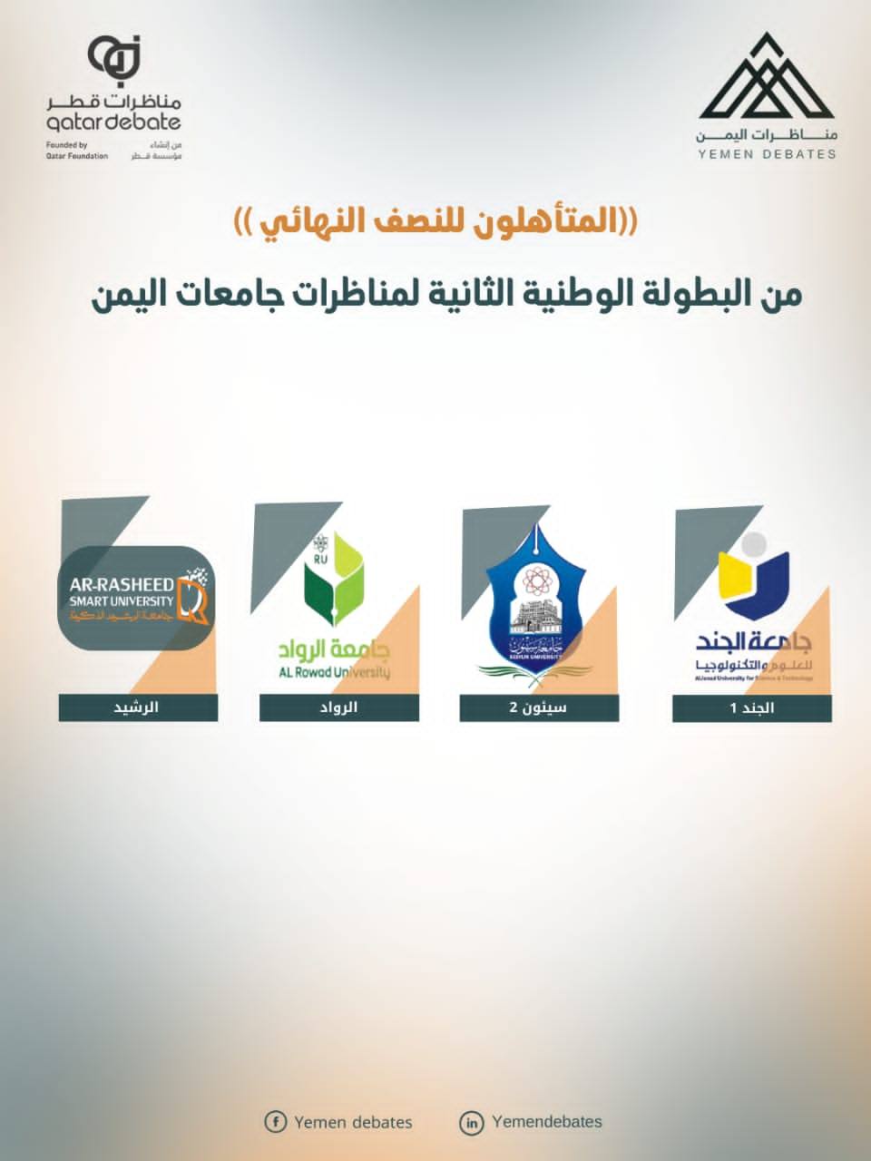 وفي الجولات التالية، خرج الفريق الثالث من المنافسة في الجولة الثالثة، فيما واصل الفريقان الآخران مشوارهما بنجاح ليتأهلا إلى الدور ربع النهائي، بعد مناظرات قوية شهدت تنافساً علمياً وفكرياً مميزاً بين الجامعات المشاركة.