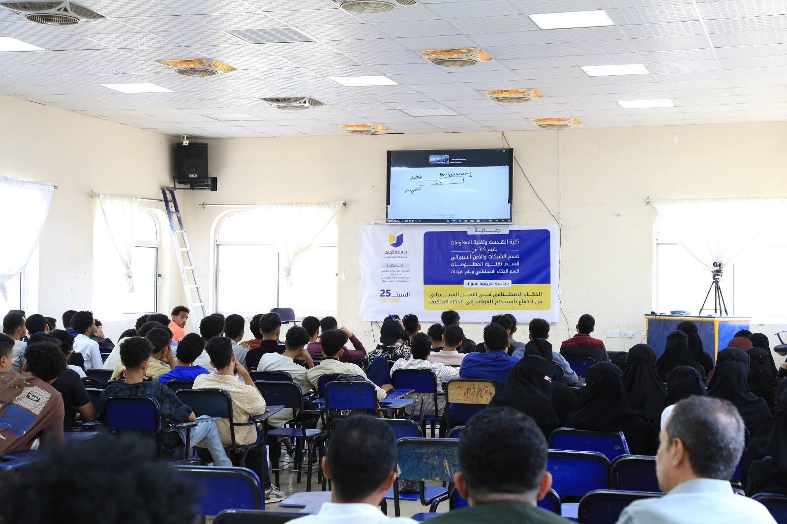 وتناول الدكتور الحيقي التحول من أنظمة الدفاع التقليدية المعتمدة على القواعد الثابتة إلى أنظمة ذكية قادرة على التكيف مع التهديدات المتجددة، مدعمًا ذلك بعرض محاكاة عملية لسيناريوهات الهجوم والدفاع، بهدف تعزيز الفهم التطبيقي لدى الطلبة وربط المفاهيم النظرية بالواقع العملي.