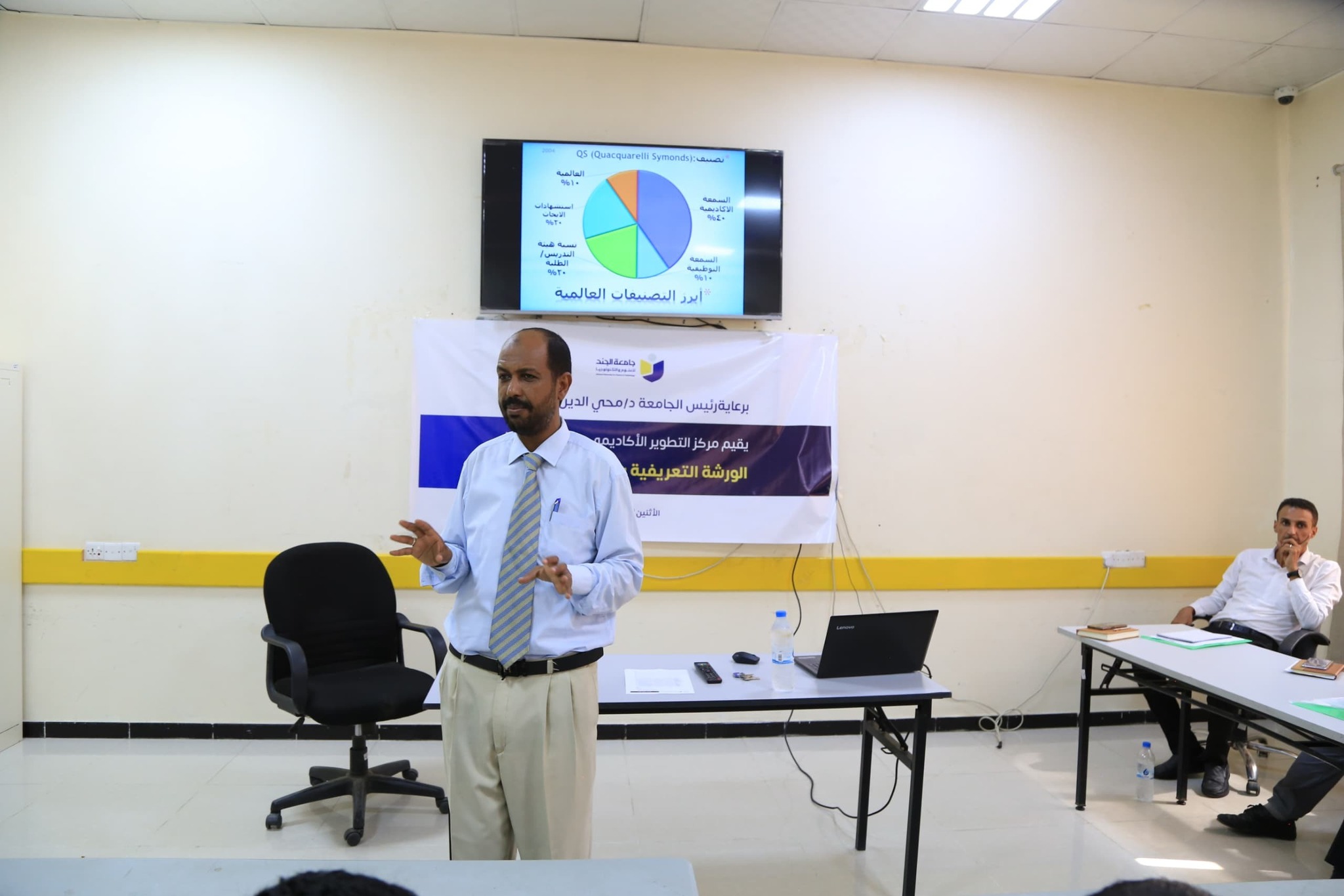 The workshop, held under the theme “Quality and Ambition” and conducted under the auspices of University President Prof. Mohyeddine Al-Qubati, highlighted the role of rankings in improving higher education standards. Sessions covered four key areas: the importance of global ranking systems, criteria for Yemen’s national methods for completing required templates, and the calculation of performance indicators.